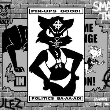 (Amusingly enough, immediately after I posted this image another Yerf-er posted -- you guessed it! -- a furry pin-up drawing.) Assuming I don't get arrested for drawing any more "dangerous cartoons," or for singing along to "London Calling" by the Clash (as happened to one unlucky fellow in England recently), I should be back in another 60 days or so. Keep up the good work, `Brazzlers! |