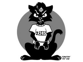 Of course, everyone knows censoring a cartoonist is the LAST thing you should ever do -- it only encourages them! I was determined to respond to this affront, so I created "T-Shirt Trouble", which depicts the "Circle-A Kitty" (as I call the character) wearing a T-Shirt similar to the one that got Cindy Sheehan arrested at Bush's State of the Union address. The reference is a bit obscure, but I figured the right-wing kooks who whined about my "Regime Change" drawing probably aren't smart enough to figure that out. And it looks like I've been right so far. I've also created "The